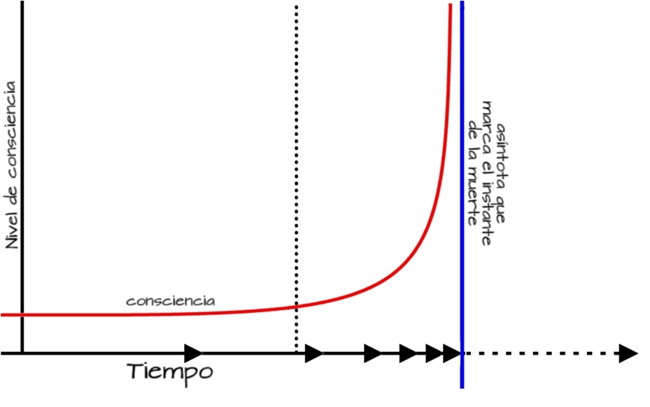 La línea punteada vertical marca los instantes previos a la muerte física. La asíntota azul marca el momento de la muerte. Entre esos dos tiempos la consciencia se expande en el tiempo e incluiría las experiencias cercanas a la muerte.