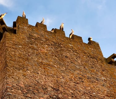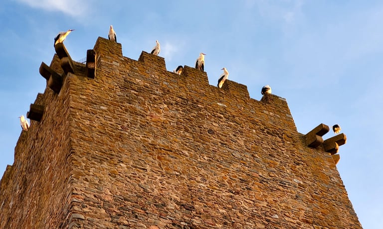 En una tarde de enero de 2024, un grupo de cigüeñas eligió posarse tanto en el torreón medieval como en la iglesia de Noviercas.